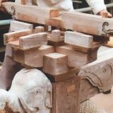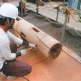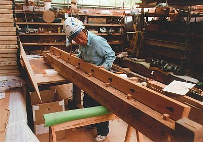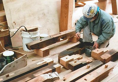 木材補修作業の様子。新材には色付けを施し、古材との違いを目立たなくする。