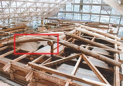 4月現在、保存修理工事は本堂の小屋組(柱より上に当たる箇所。屋根やそれを支える部分)の組み立てが行われています。