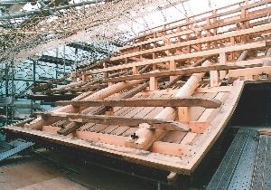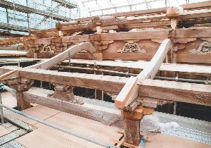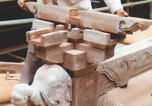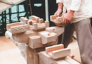 下の写真は本堂出入り口の柱の上にある組物(くみもの)と呼ばれる部分と、本堂側面にある大瓶束(たいへいづか)と呼ばれる部分の組み立て過程です。複数の部材を組み合わせて作られています。
