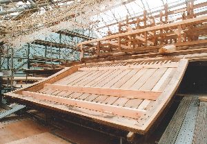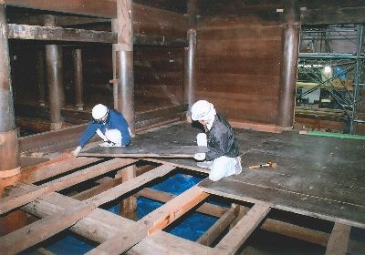 本堂の床の取り付け状況。