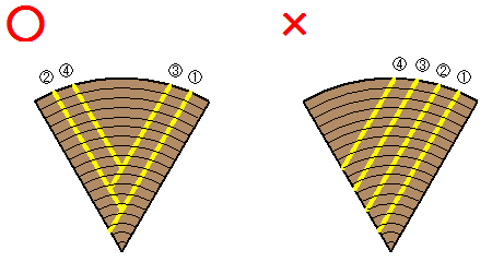 1枚取ったら次は反対側から1枚取ります。目の詰まった板を一枚でも多く取れるように、互い違いに板を取っていきます(下図参照)。