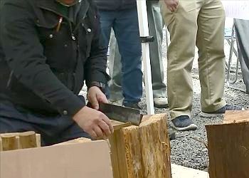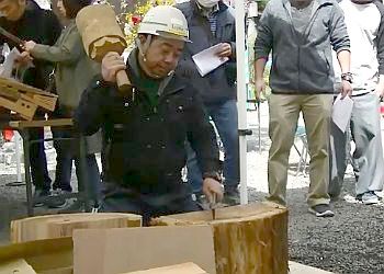 木槌で叩いて刃を食い込ませると、そのまま割台(わりだい)という器具に移動させて固定し