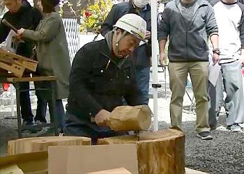 手首を返して割ります(この作業を2回繰り返して、天台寺本堂屋根に用いる厚みに変えます)。