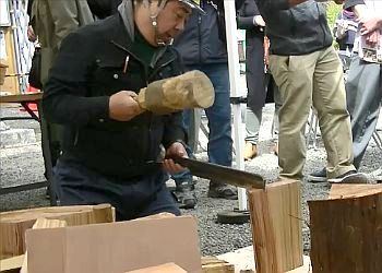先程の刃物と木槌とで、板を更に割っていきます。