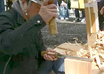 屋根を葺く作業は、左手で板を押さえながら右手で金槌を振ります。これを屋根という不安定な場所でも効率良く進めていくため、職人さんは板を留める竹釘を自分の口の中に収納して、次のような手順で屋根板を葺いていきます。