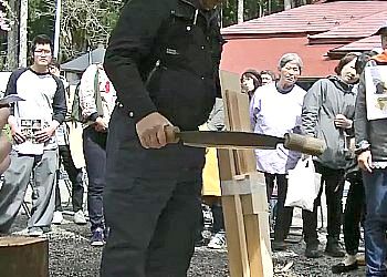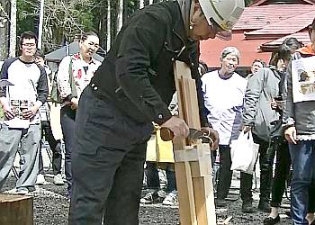 次に、立てた板の真ん中に刃物を当て