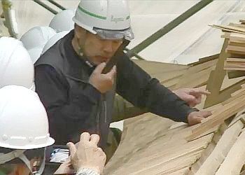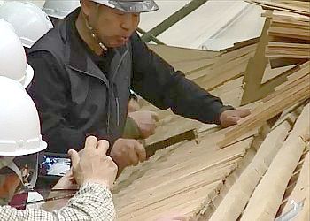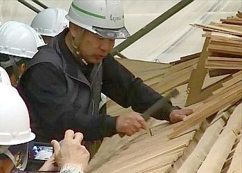 平成30年5月5日の保存修理工事現場公開では、屋根板を作る工程や葺(ふ)く作業もお見せしました。