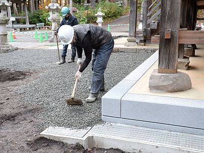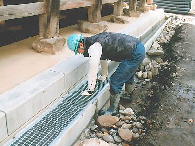 本堂縁周りにコンクリートを打設し、排水溝を設置し、その上に砂利を敷きました。
